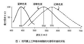 當人們做這個實驗的時候,有個驚人的發(fā)現(xiàn),那*是:發(fā)現(xiàn)了視網(wǎng)膜上不同的視錐細胞對光譜存在著三種不同的吸收,因而*出現(xiàn)了三種不同的吸收曲線。下面的曲線圖*是其一。只不過是,該圖把三種不同的視錐細胞的光譜吸收曲線畫在同一張圖上了(該圖選自劉家琦,李鳳嗚主編的《實用眼科學》第二版.北京人民衛(wèi)生出版社,1999年版.第50頁)。這張圖的意思是,用400nm到700nm的色光去單獨照射每個視錐細胞時,其結(jié)果是:反射回來的光的數(shù)量并不是一樣多,而是有三種。因而,*繪制出了三種不同的吸收曲線圖。并且,這三條曲線各自占據(jù)了光譜中的藍區(qū)、綠區(qū)、紅區(qū)的不同位置。因此人們便依據(jù)這一點得出了,視網(wǎng)膜接受外界光線刺激時,可以產(chǎn)生出紅、綠、藍三種原色的觀點。